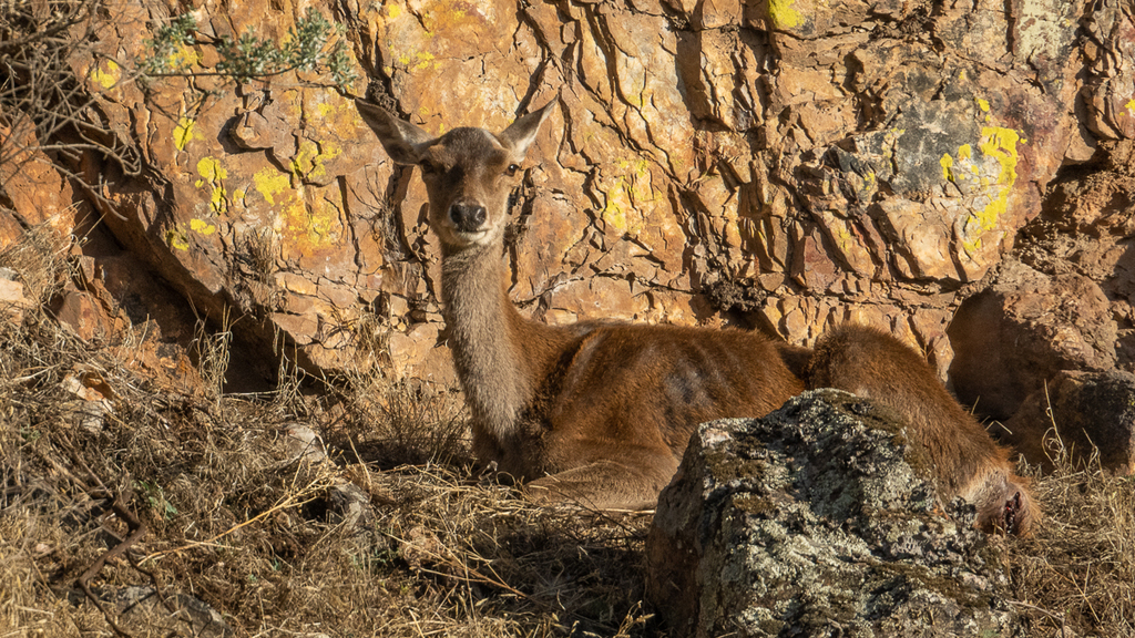 His antlers are well-developed for his age, rising cleanly from his crown with strong beams and the early suggestion of a forming coronet. Though not yet at their full span, they carry the promise of impressive growth. His eyes are dark and alert, ears constantly turning, betraying a sentinel’s awareness even in moments of rest.