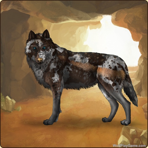 Eyes: Aqua (Uncommon) Nose: Peach (Rare) Base Coat: White (Common) Leg Type: Medium Leg Color: Slate Head Type: None Head Color: Slate Tail Type: Half Muzzle Type: Stripe Muzzle Color: None Harlequin: Hickory Somatic Mutation: Hickory Back Type: Side Splash Back Color: Brown Belton: Blue Speckle Type: Full Speckle Color: Cream |