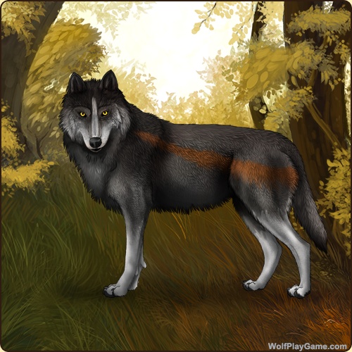 Base Coat: Black (Common) Eyes: Gold (Common) Nose: Black (Common) Leg Type: Medium Leg Color: White Head Type: Cheeks Head Color: White Muzzle Type: Stripe Muzzle Color: White Back Type: Side Splash Back Color: Red |