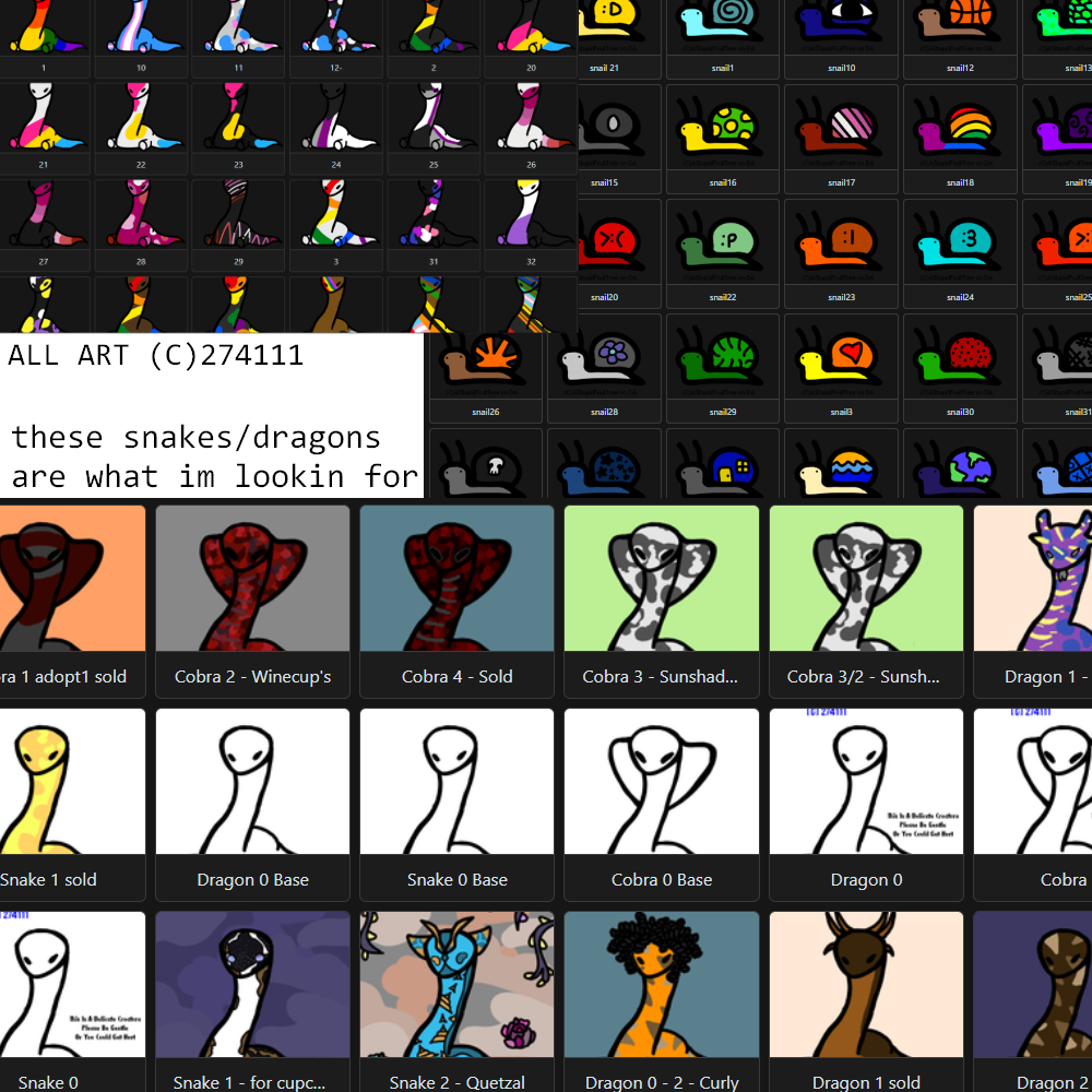 Mostly snakes. Any of this art is likely tagged with my pack number, 274111.