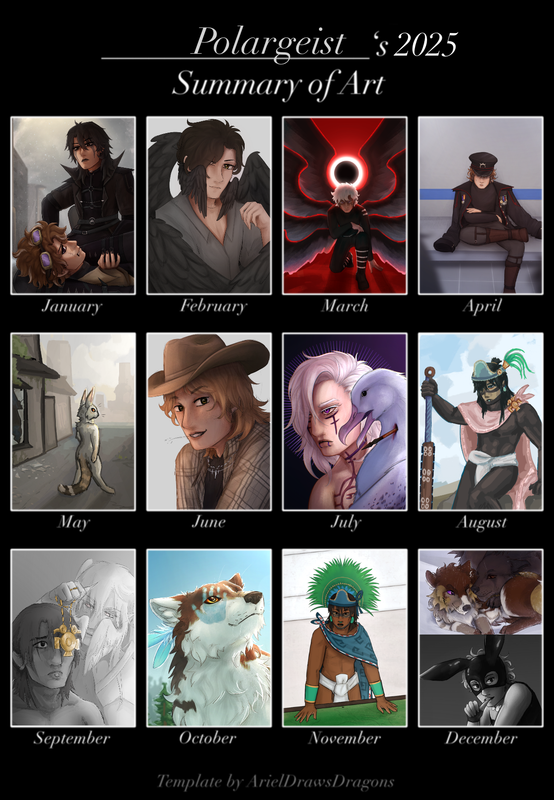 First of all, this year I've leaned a lot into anatomy and technical stuff like perspective and composition to start pinpointing my style and it has worked ?? I believe. I drew more pieces this year than last year, which is definitely an improvement :D I basically had a full piece for every month!! Fighting the evil 3/4 angle has been going. Eh. Better recently LMAO. There's only so many angles to choose from and still showcase everything I fear