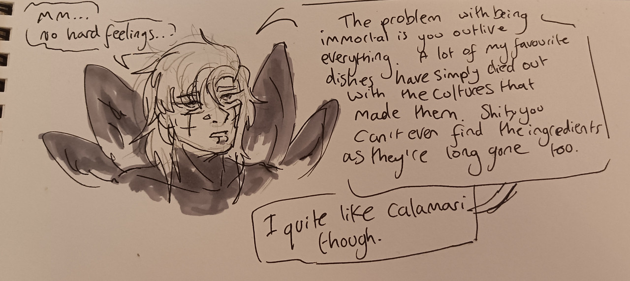 Eagle's Sorrow said: Apollo, oop- uhh sorry I think but what is your favorite food:3 Kobel, real, no you did not, but what is your favorite food?(Let me guess, humans?) Sascha, uhh your hair is dripping, what is your favorite food?
