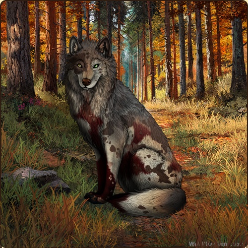 Base Coat: Natural 4 (Common) Eyes: Gold-Green (Common) Nose: Brick (Legendary) Leg Type: Mitts Leg Color: Red Head Type: Reverse Facemask Head Color: Red Harlequin: Hickory Back Type #2: Crest Back Color #2: None Shoulder: Blue Piebald 3: Rosewood Speckle Type: Shoulder Speckle Color: None Ear Edges Type: None Ear Edges Color: Red |